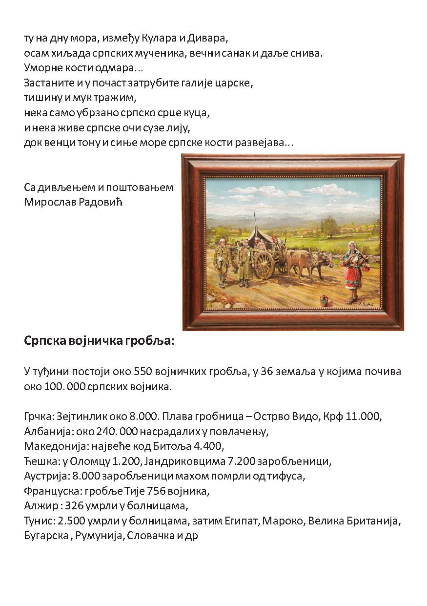 I zato pitam Srbina u sebi. Odkud ti to da lako zaboraviš: jeftino potrosene srpske glave, prerezane vratove, nerođenu decu, sasečenu mladost u ratovima koji su se mogli izbeci, vešanja majki sestara i devojaka, zamki raznonamenskih, što krvlju svojom placaš prolivanje tuđe krvi, licemerje koje nikad neceš shvatiti, mržnju onih koji vide da si bolji od njih, da mu oprostiš što je tvom pradedi vadio oči kao da otvara ostrige i da i to zaboraviš,to sto praviš bratstvo i jedinstvo sa tvojim krvnikom koji drži kamu iza leđa,to što veruješda ne može da ti se desi ono što ti ne možešdrugom uraditi, to što zineš od čuda šta se zbiva u sudaru laži i nevinosti, to što svo zlo koje trpiš mora da bude baš u tvojoj avliji, to što sebe pitaš stalno zašto?,zašto ti se baš sve ponavlja, zašto mnogi iz tvog roda odoše od majke Srbije da svoj dom sviju negde daleko, da ponesu semku Srbije i da je umnože s drugima a da opet unuci njihovi osećaju zov Srbije,i opet zašto, zašto? Zašto ti nikada nece biti jasno zašto ovoliko razbacanih kostiju daleko od majke Srbije.